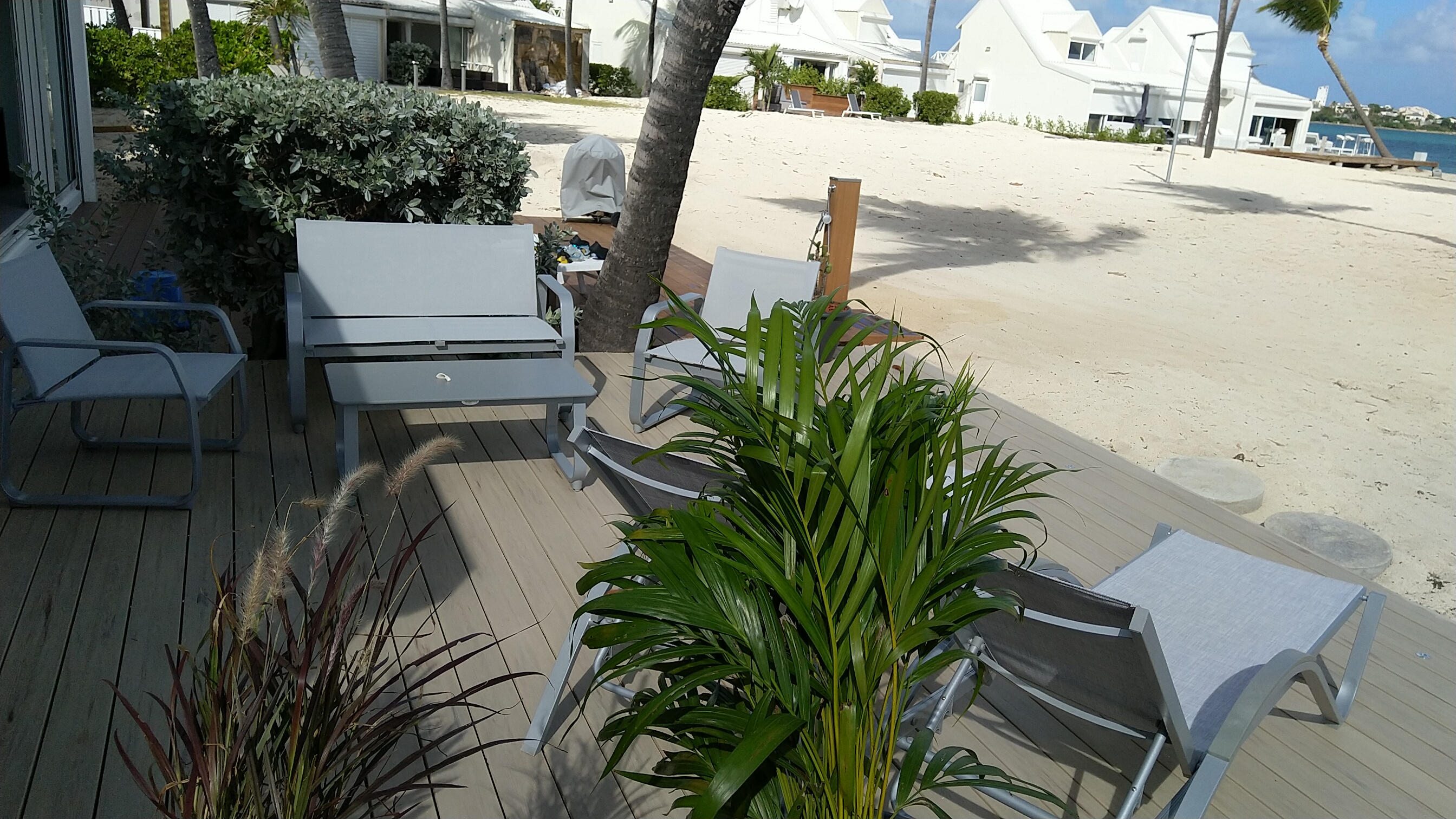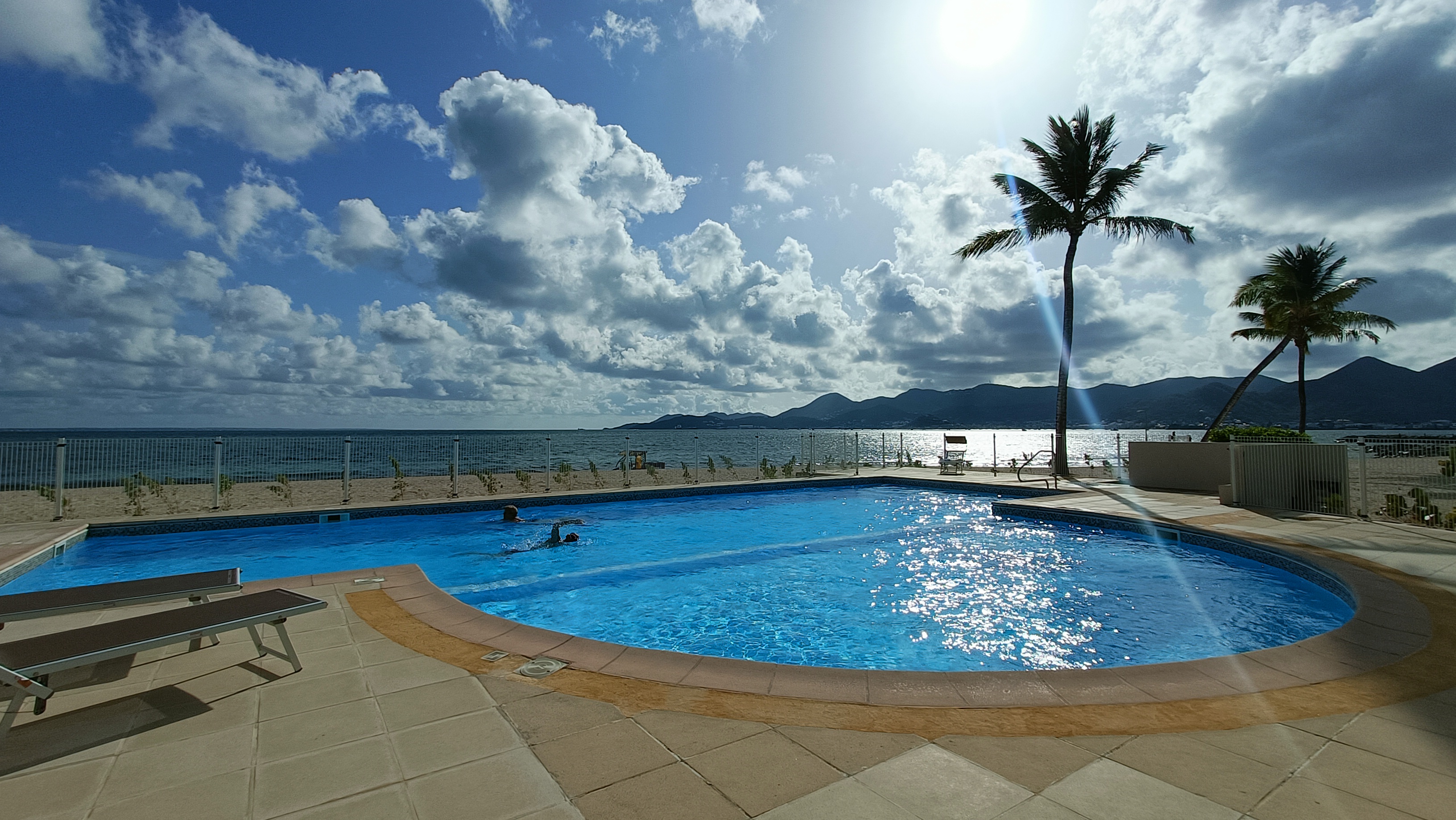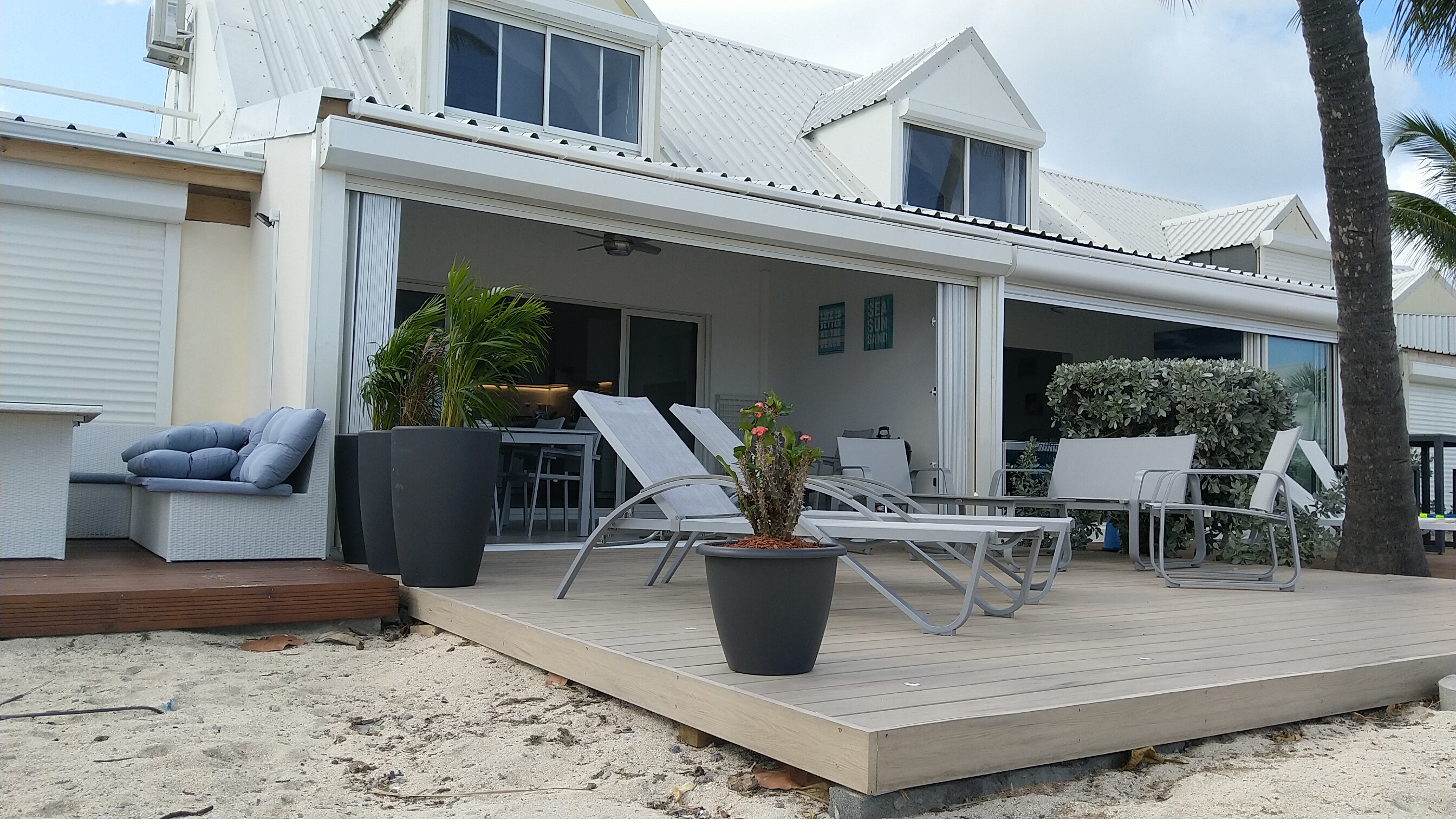 Face à la mer, votre maison duplex sur la plage de Baie Nettlé, comprend un total de 7 couchages, un grand salon/cuisine, une salle à manger sous la terrasse couverte, deux chambres, deux salles de bains, WC, solarium à l'étage et deck sur le sable...